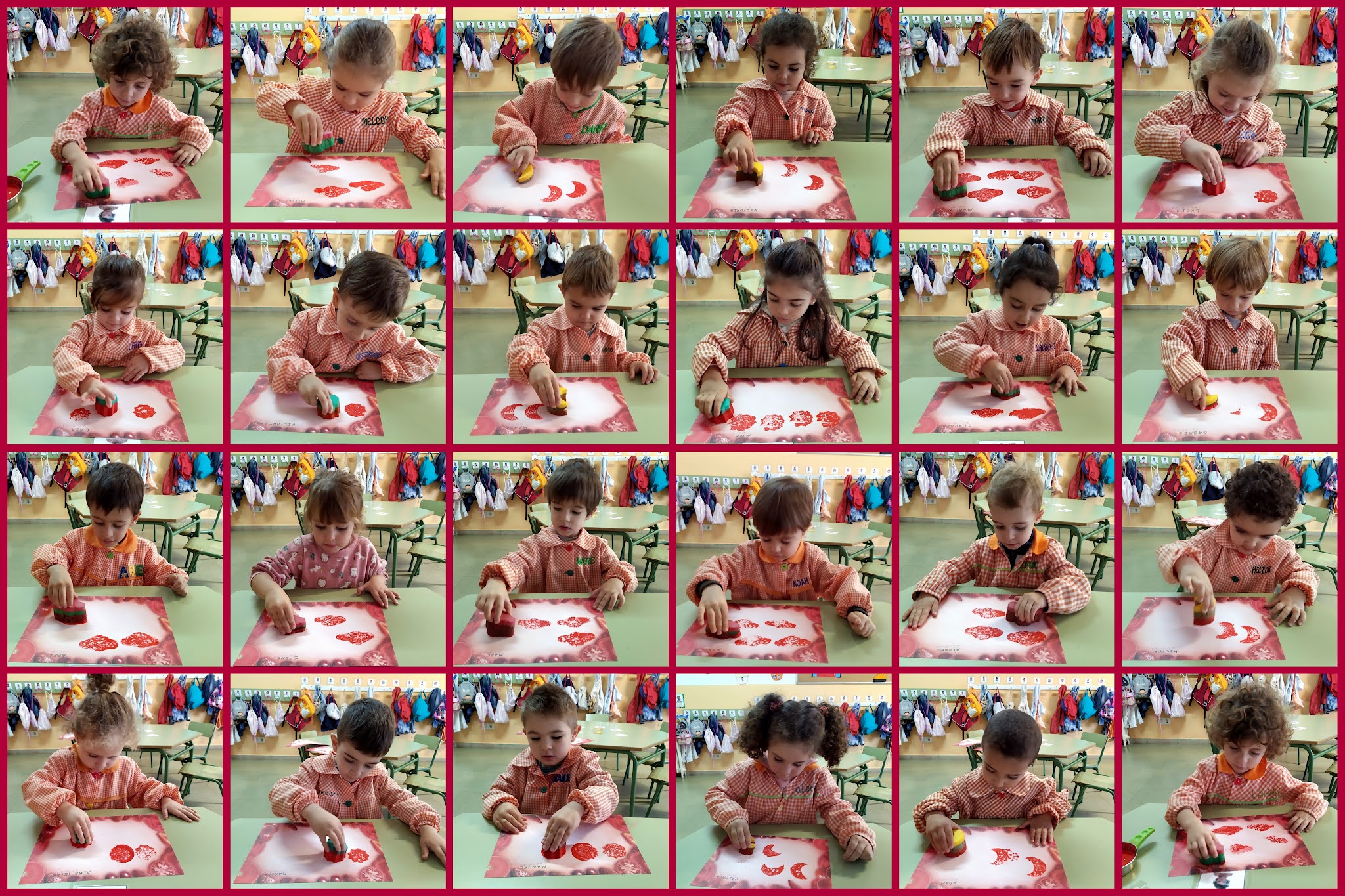 En la segunda ficha plástica, había que estampar unas formas de esponja mojadas en pintura de dedo roja. Había que tener mucho cuidado y para evitar manchas, salpicones y "churretes", lo hicimos de uno en uno. He de confesar que me volvieron a sorprender mis peques por lo bien que lo hicieron...