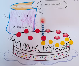 Había que colorear el libro de la Constitución y, con gometes rojos y amarillos, decorar la tarta. Pero en el reverso de la ficha, les dibujé una bandera y un mapa de España. Había que colorear, la bandera roja y amarilla y el mapa del color que cada uno quisiera... Debajo del mapa estaba escrita, en mayúsculas, la palabra "ESPAÑA" y algunos niños y niñas se atrevieron a copiarla...
